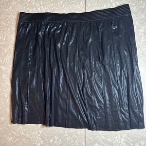 Black iridescent elastic waist plus size skirt. Cool faux pleat and faux leather effect with textured waistband. Fun and flirty great for date night.