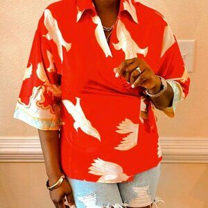 This stylish set features a wrap top and wide-leg pants, adorned with a vibrant bird print. Made for comfort and elegance, ideal for casual or semi-formal wear.