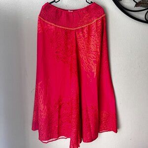 These wide-leg pants are designed with a smocked waist for comfort and style. Featuring a vibrant red and orange pattern, they offer a lightweight and flowy fit.
