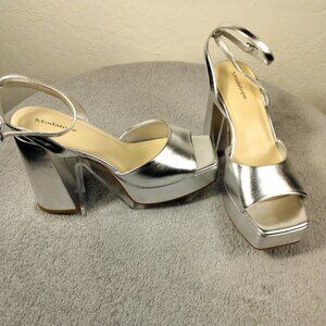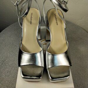 Turn heads in these bold and glamorous Modatope metallic silver platform sandals. With their striking high block heel and sturdy platform, these heels bring both style and comfort for any night out.
