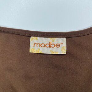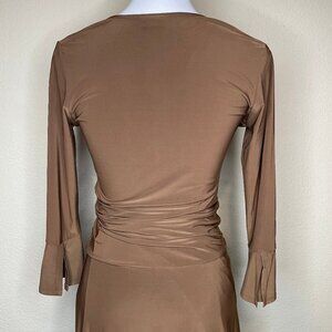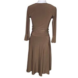 Modbe Chocolate Brown Surplice Wrap Dress Bell Sleeve Ruched Waist Stretchy Midi