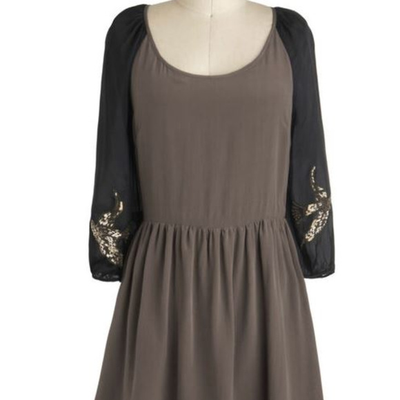 Warm grey/taupe dress with sheer, black, slightly puffed raglan sleeves. Lovely gold sequined, bead-embellished birds on the sleeves.