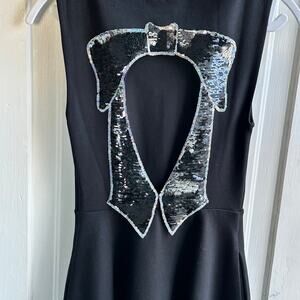 Large teardrop cutout at the open back framed by a stunning bow motif that is beautifully embellished with black and metallic silver sequins