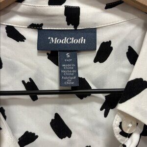 Stylish button-down with bold black patterns on white. Perfect for casual wear.