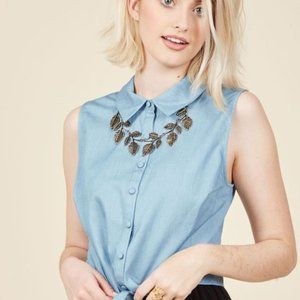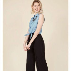 Modcloth Blue Chambray Button Up Sleeveless Tie Waist Top Blouse Size M EUC