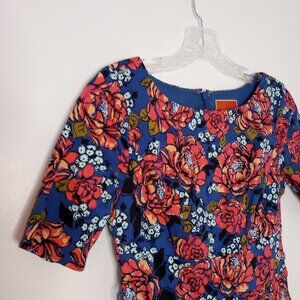 Modcloth blue & pink floral print fit & flare dress, short sleeves, zips up the back, lined. Has 2 side loops, but no belt included. Cute retro style dress for work, school, casual wear, date night.