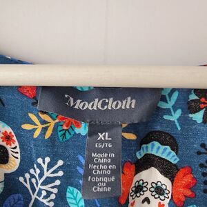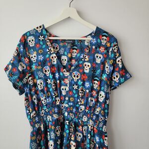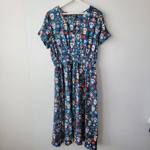 Vibrant blue midi dress with colorful skull pattern. Short sleeves and gathered waist, pockets.