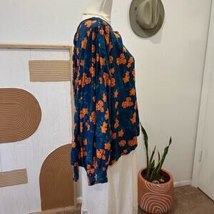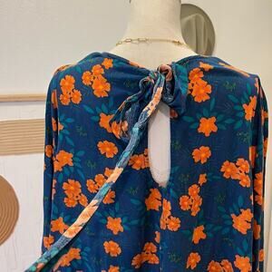 Modcloth Blue Viscose Orange Floral Long Sleeve Back Tie Blouse Plus 26