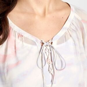 Pink, hand-dyed tie-dye pattern atop a sheer construction and long balloon sleeves on either side of lace-up notched neckline, this bohemian-inspired top.