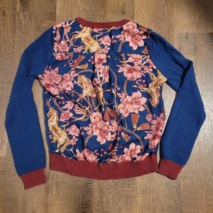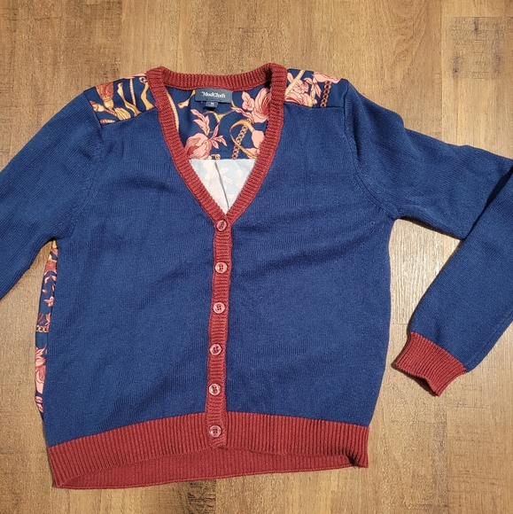 Super cute Modcloth cardigan. Very unique! The front is blue and maroon and the back is a silky flower design. It's in great condition and from a smoke free home.