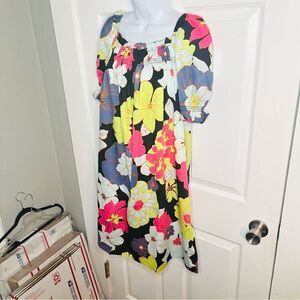 Modcloth Casual Breezy Daytime Mood Babydoll Dress Black Honolulu Floral Size Medium NWOT. Black babydoll dress from ModCloth namesake label made in lightweight, breathable cotton sateen fabric, unlined sundress. 1970s summer silhouettes, trapeze dress, square neckline, gathering, delicate smocking at front and back yoke seams, ruffle-trim, elasticized short puff sleeves, easy, breezy loose fit. Hand-drawn vintage inspired tropical floral print with groovy blossoms in bright hues of lime green, powder blue, pink, and denim blue with orange outlining throughout, casual dress. 100 %Cotton. Machine wash. Unlined. Semi-sheer. New without tags. Never worn, came from Modcloth without tags.