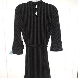 Mock neck dress impresses with its neckline keyhole, cropped bell sleeves, comfortable gathered waist, and flocked, metallic chevron pattern. Rock this knit darling with sheer stockings and knee-high boots.