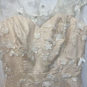 Details: Cream midi dress with an overlay of embroidered florals and leaves.