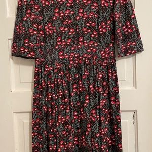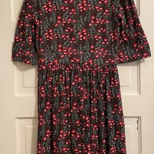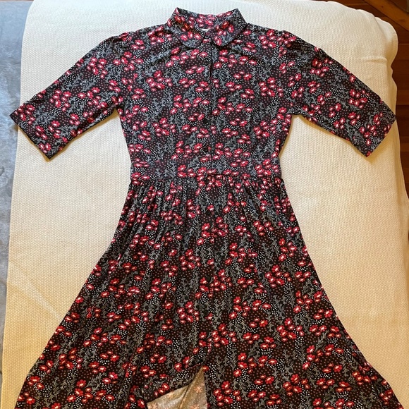 Beautiful, NWT shirt dress. The brand is Circus, bought from Modcloth. UK 12/US 8. Black background with red & white flowers. 97% cotton, 3% lycra (I would describe the feel as heavy jersey). Fitted waist with somewhat full skirt, 1950s styling. Elbow-length notched sleeves. Please see photos for measurements. Happy to answer any questions.