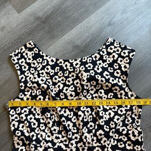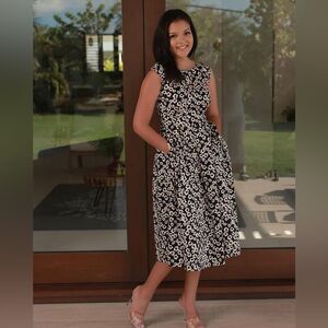 Sophisticated black and cream floral midi dress by Closet London from Modcloth. Fit and flare silhouette with hidden side pockets and a tie back closure. The back is cut in a V with a golden zipper. Please see photo section for approximate flat measurements.