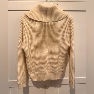 Elegant cream cowl neck sweater. Soft knit texture. Ideal for layering.
