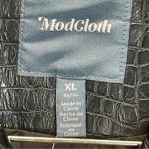 Don’t let your inner 1980s rocker slip away into obscurity. Let them shine through with this crocodile-embossed faux leather moto jacket from our ModCloth namesake label. Asymmetrical zip-front closure with zip pockets at sides for a classic motorcycle jacket silhouette. The perfect statement-making staple piece for fall, this jacket’s jet black hue elevates the look in a chic, timeless way.
