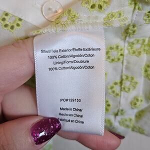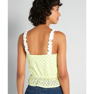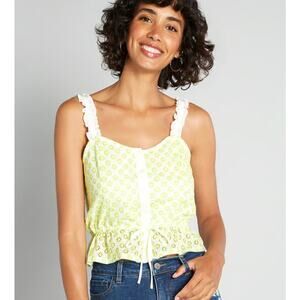 Inspired by classic cottagecore aesthetics taken from the 1970s, this romantic cami is a fun and feminine way to take you from spring to summer seamlessly. Made from a smooth, crisp white woven cotton fabric, this sleeveless top boasts prairie-inspired detailing like frilly ruffle trimmings at the cami straps and is covered with a retro-fab miniature, embroidered floral eyelet pattern in bright acid green all over the bodice. With a vintage-inspired contrasting full button-up front closure and an adjustable drawstring that gathers and ties at the drop waist to create a subtle peplum hem.