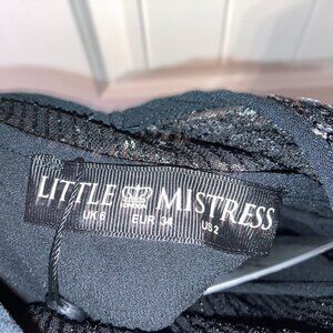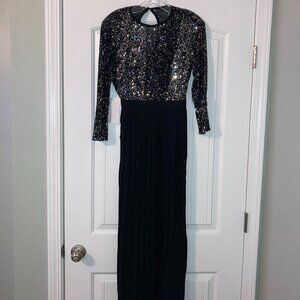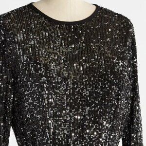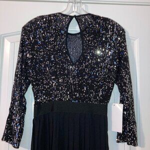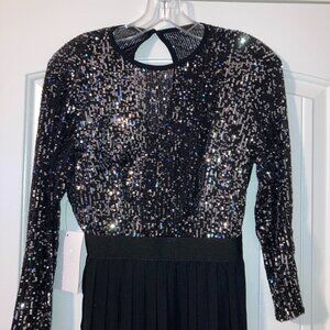 The stretchy long sleeved bodice with a scoop neckline and a keyhole button-closure at the back features glittering gunmetal sequins throughout, and the black high-waisted skirt is perfectly pleated. Such a unique find and perfect for celebrating the New Year, you'll love rocking this fun and flashy style.