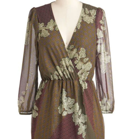 Intriguing green mixed pattern dress. Combo of patterns - floral, dotted, and medallion.