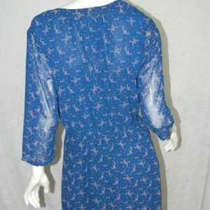 Modcloth Dress Navy Blue with Pink Stars Drawstring Waist Sheer Sleeves Fully Lined Ruffle Bottom Mini Dress Size Large