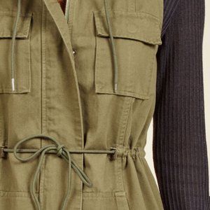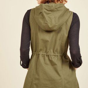 "Thanks to the versatility of this green vest, the question isn't what you'll wear with its plentiful pockets & protective hood - it's where in the world you'll flaunt it next! Further equipped with snaps & a flattering drawstring waistline, this cotton, ModCloth-exclusive garment is always adventure-ready. 100% Cotton. Machine wash. Fabric does not provide stretch. Adjustable drawstring. Front & chest pockets. Unlined. Front zipper & snap closure."