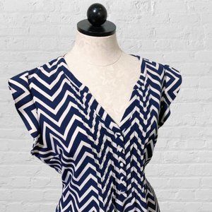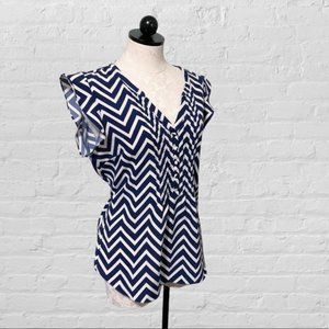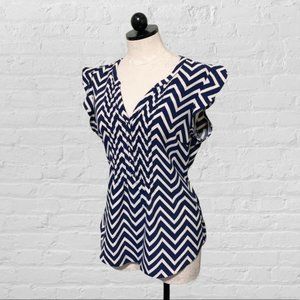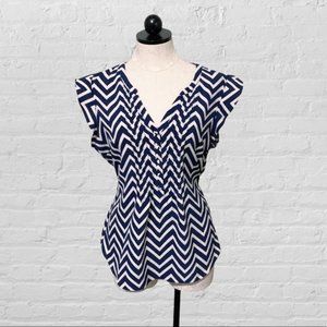 • Tied-back blouse featuring navy and white chevron stripes, a pintucked, buttoned front, and flutter sleeves