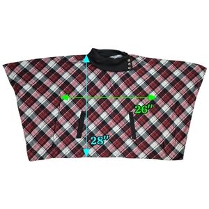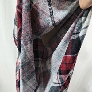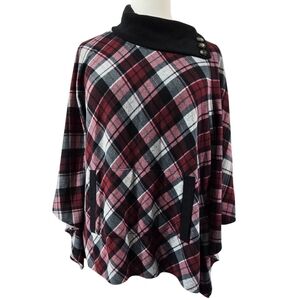 Good used condition, with no stains or tears. A unique grey and dark red diagonal plaid poncho. Has an asymmetrical cowl neck with buttons, armholes, and a kangaroo pocket. Has stretch. 1X/2X.