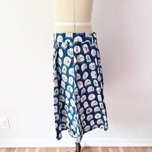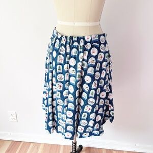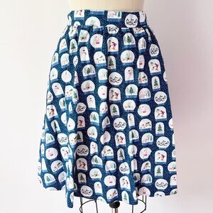 Delightful blue A-line skirt with charming snow globe pattern. Ideal for a festive look. Elastic back and back center zipper. Side pockets.