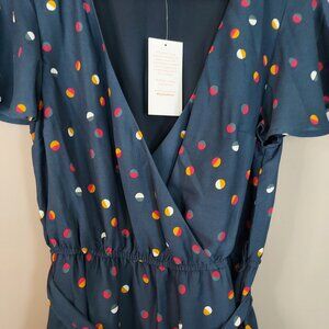 Size large Modcloth Fits of Bliss Polka-dot Short Flutter Sleeve Midi Dress. Polyester and lined. Surplice bodice. Elasticized waist. Side pockets. Removable sash. Pit to pit 18.5" Length 45". Brand new and never worn.