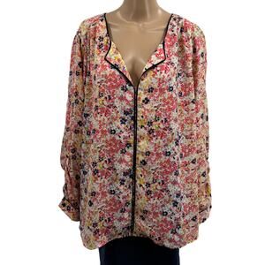 Even a late night deserves your best style effort. Show you agree by sporting this floral top. Boasting a notched neckline, tab sleeves, and a contrasting trim down the center. Long sleeves. Pulls on. Semi sheer. Looks great as is or tucked in. Polyester. Machine wash. In preowned condition.
