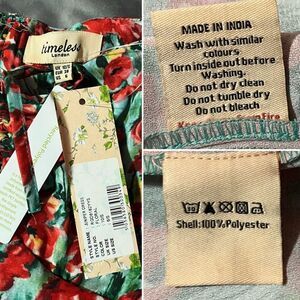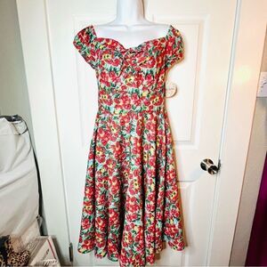 Modcloth Timeless Floral Sheen of Spring Fit & Flare Midi Sundress Off Shoulder Green Red Size 6 NWT. Floral flurry of hand-painted red and yellow blooms in green grass, fit-and-flare dress from Timeless London! Perfect for springtime, fitted bodice, vintage-inspired, elasticized cap sleeves, option for off the shoulder silhouette, and sweetheart neckline. Adjustable drawstring at bust for custom fit. Lightweight, recycled and sustainable woven fabric, stylish mid length swing dress, handy side pockets!Polyester. Machine wash. Side pockets. Back zipper with hook and eye closure. Runs true to size. New with tags.