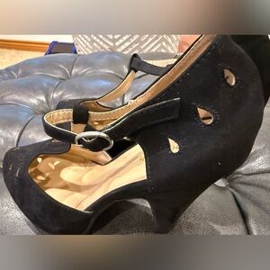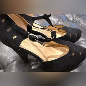 Step into versatility with elegance meets whimsygoth meets party girl. These Modcloth black heels, featuring a classic Mary Jane-style ankle strap and delicate cutout details. Crafted from a suede-like material, these shoes offer a versatile touch with their closed toe and low heel design. Perfect for adding a touch of charm to any outfit.