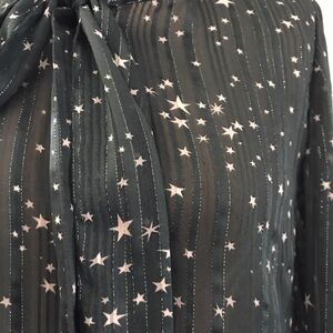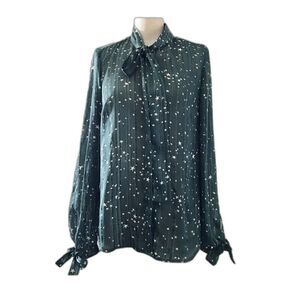 Long sleeves, Buttons down front, Ties and neck and cuff, Partially sheer