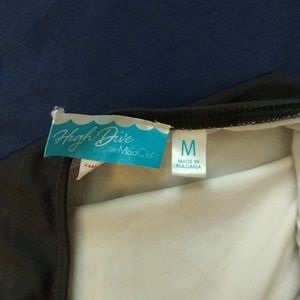 Modcloth size medium stretchy material high dive swim suit. It fits like small but its stretchy enough to fit me. I would prefer a larger size on me. Pre owned. Tag is coming off a bit.