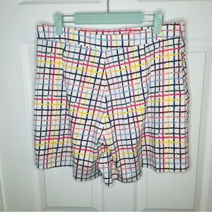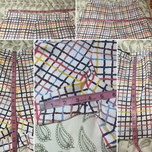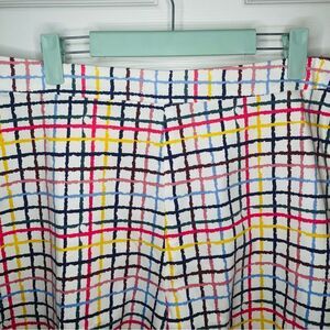 Modcloth High Waist Party Streamers Shorts Blue Pink Rainbow Plaid 12 NWT. Fun High-rise white shorts covered in an exclusive gingham plaid print in a vibrant rainbow-striped pattern of red, yellow, pink, blue, purple, and green. As darling as unique, playful spring and summer. Retro-fab high-rise silhouette. Wear these super cute vintage-inspired shorts anytime you feel like celebrating just for the fun of it! New with tags. Unlined No pockets. Side zip. 97% Cotton, 3% Elastane.