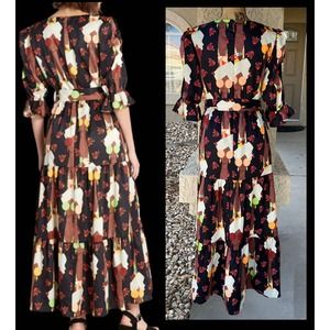 Made from a lightweight woven fabric, this boho-inspired black dress from Hutch is covered in gorgeous women looking fly in their 1970s style sunglasses in hues of pink, green, and yellow, and keeping cool with their hair wrapped in a white scarf. Such an iconic retro-fab look, these gorgeous gals are in the height of fashion as they grace this one-of-a-kind dress boasting a lovely square neckline with keyhole and button-loop closure at the back, ¾ puff sleeves with ruffle detailing at the elasticized cuffs, and a matching fabric-covered belt that is removable and has a tortoise-shell acrylic buckle. The gathered waistline creates the first of three tiers of gathered fabric that makes this long skirt full and flowy, and the handy side pockets are always a must-have. Just, wow!