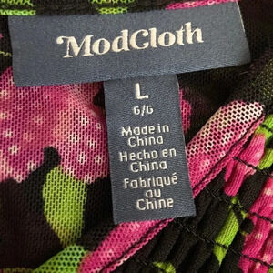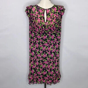 Modcloth Jam Packed on the Prairie Mini Dress in Raspberry Thicket Black - Large. Excellent pre-owned, like new condition. Tiered ruffle-trim detailing at the front and back yoke seams, which drape over the shoulders for frilly, fluttery cap sleeves, along with the all over print of pink raspberries hanging off of green, leafy vines. Made from a stretchy black mesh, this cute dress features smocking at front and back yoke. Approximate measurements: 19" bust, 35" length.