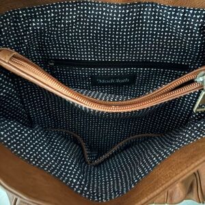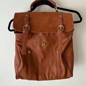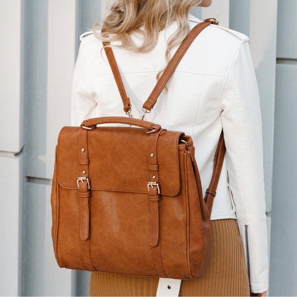 Chic tan leather backpack with stylish interior design. Straps can be worn cross body with on stra or like a backpack with two straps. Straps are very adjustable and make it such a versatile bag. Partially made of genuine leather with some parts faux leather. Very durable and in great condition!