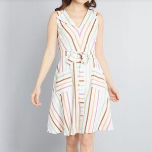 The feminine lapels, sash-tied waist, and patch pockets of this cotton-linen-blend dress from our ModCloth namesake label take cues from the past - and will have others taking note of such a nostalgic look. A gorgeous array of pastel stripes further enliven this white A-line wonder.