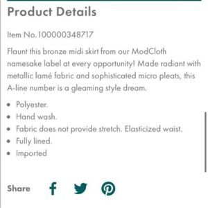 Modcloth Metallic Skirt Glitz The Metallic Midi Skirt Tie Elastic Waist Bronze Size Small. Pleated Metallic Lame’ fabric. Drawstring tie elasticized waist. Fully lined. Lined. NWT