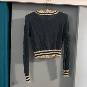 This cropped sweater from Modcloth has a slightly open weave so it's perfect for layering over a collared shirt or a dress. Pretty slate blue color with vintage inspired striped cuffs and binding. EUC with no issues.