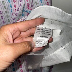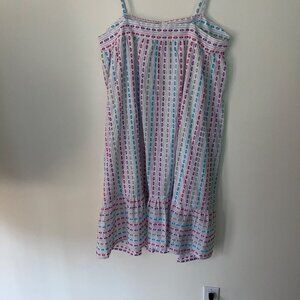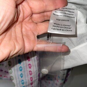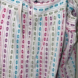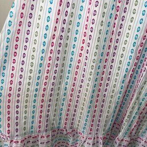 Constructed from off white -hued, lightweight cotton-blend weave that boasts an exclusive, all over embroidered vertical stripe design with textured dots in shades of green, blue, pink, and purple.