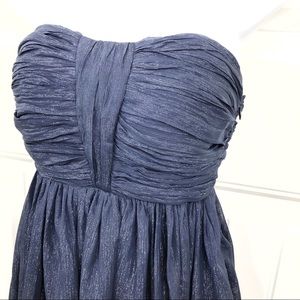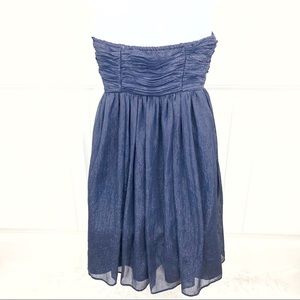 Modcloth Minuet navy blue metallic strapless mini cocktail dress. Shirred padded bust. Side zip. High waist.