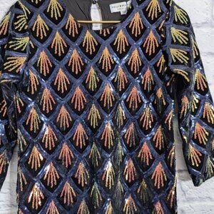 Baby, you’ll look better than a New Year’s firework in this sparkling Molly Bracken number. Made from a sequin embellished fabric that is made-up of black, navy blue, and iridescent sequins that are strung together to create an art deco-inspired, firework pattern that will leave you feeling absolutely dazzling, this vintage-inspired shift silhouette will be a forever favorite.