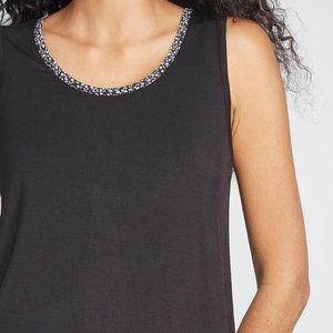 This black tank top makes a case for elevated basics with its contrast neckline detail a delicate, white floral print. Subtle vents at each side seam and a comfortable silhouette formed from soft jersey knit further imbue this on-the-go style with irrefutable charm.