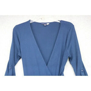 This is a Modcloth Women's Navy Blue Midi Wrap Dress that is a size Small. It has 3/4 Roll Tab Sleeves. It is 95% Polyester and 5% Spandex. Laying flat, it measures: Armpit to armpit-17.5" and the length is 41". It is in great condition.