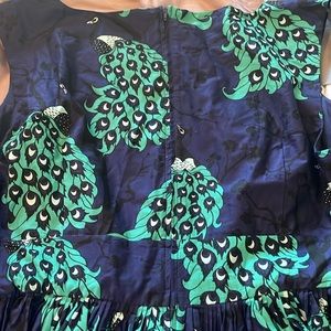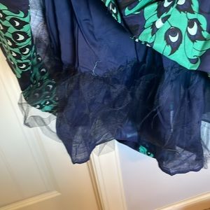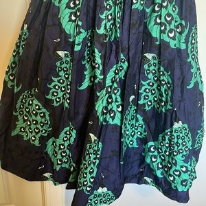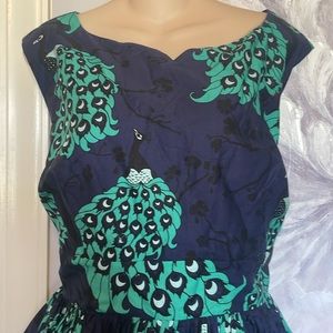 Elegant navy dress with vibrant green patterns. Cap sleeves and flared skirt. Perfect for any occasion.