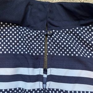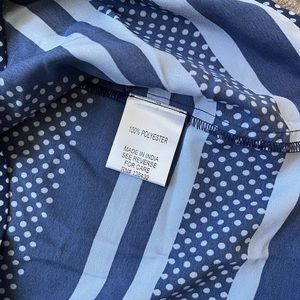 Stylish navy and white striped blouse. Features polka dot accents. Three-quarter sleeves. Perfect for casual wear.