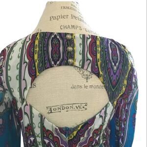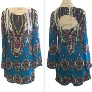 Pink Owl Modcloth mini dress tunic with peekaboo back and bell sleeves. Dress is lined and has beautiful detail from the fabric design to the detailed buttoned peekaboo back. Excellent like new condition.